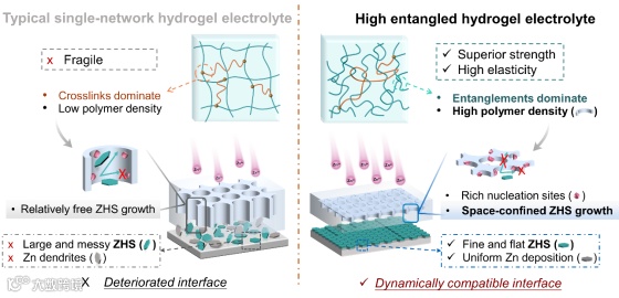 图1. 通过调整聚合物结构构建高缠连水凝胶电解质对柔性锌金属电池的意义。