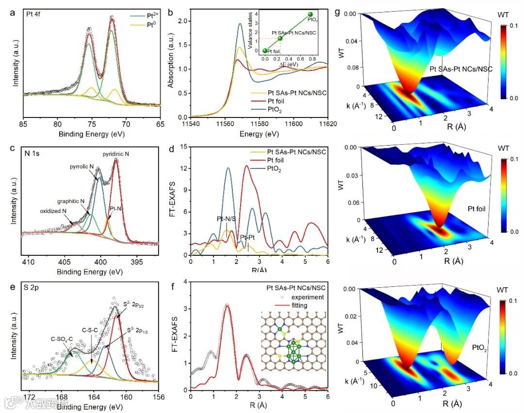 图2. a) Pt SAs-Pt NCs/NSC的Pt 4f XPS, c) N 1s XPS, e) Pt SAs-Pt NCs/NSC的 S 2p XPS, b) Pt L-edge的XANES(插图为Pt的平均氧化态拟合),d) FT-EXAFS光谱,f) R空间的EXAFS拟合,g) 小波变换图。