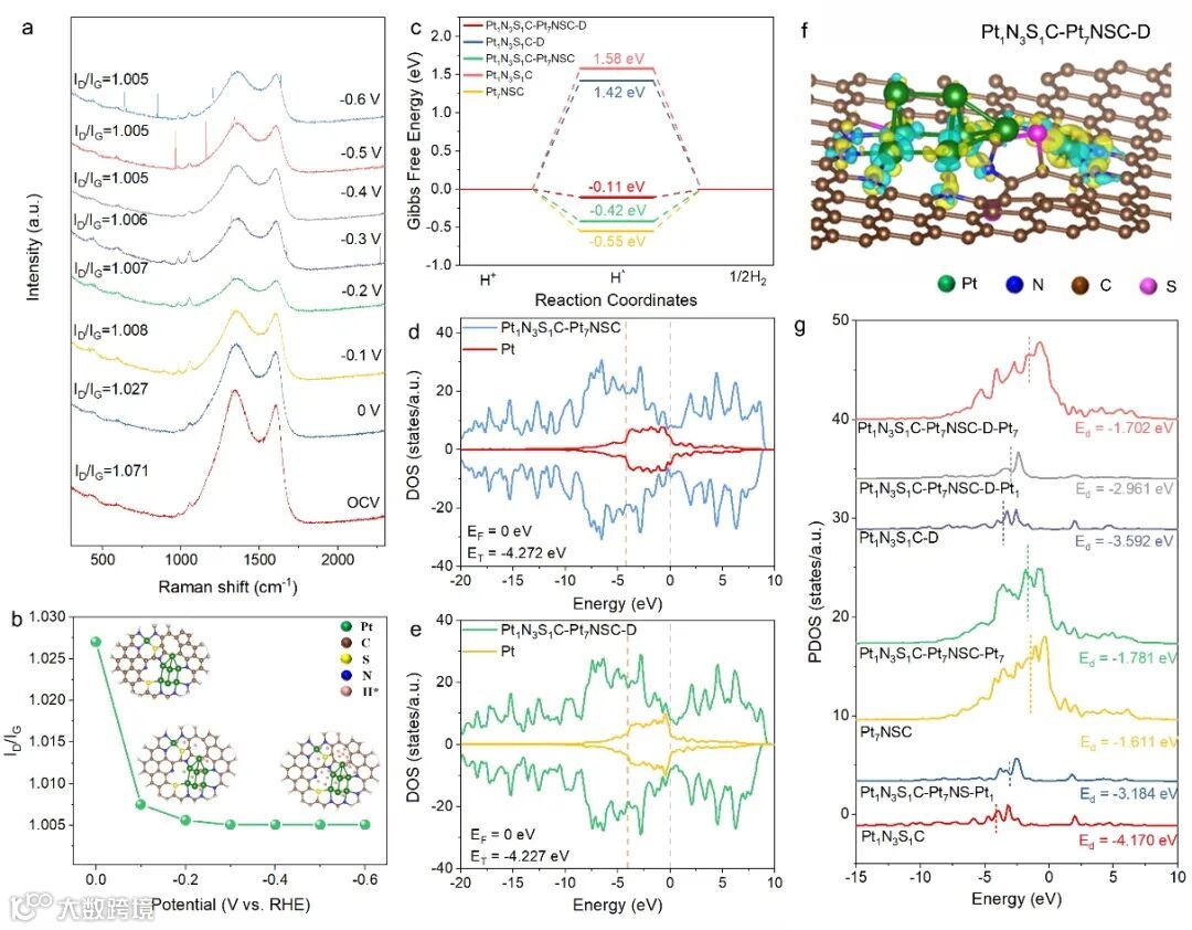 图4. a)原位拉曼,b) ID/IG值随电位的变化,c)酸性HER过程ΔGH*, d) Pt1N3S1C-Pt7NSC的DOS图,e) Pt1N3S1C-Pt7NSC-D的DOS图,f) Pt1N3S1C-Pt7NSC-D的电荷密度差,g) Pt d轨道的投影电子态密度。