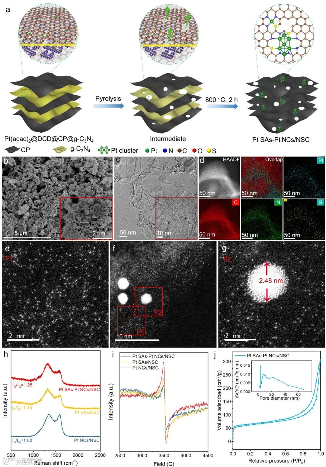 扫描电镜(SEM)(图1b)和透射电镜(TEM)(图1c)显示了薄片层的形貌结构。Pt SAs-Pt NCs/NSC催化剂的像差校正高角度环形暗场扫描透射电镜(AC-HAADF-STEM)图像(图1e-g)中,存在尺寸均匀的NCs和大量均匀分散的SAs,Pt NCs的粒径约为2.48 nm,与HRTEM图像一致。在拉曼光谱中,Pt SAs-Pt NCs/NSC催化剂的ID/IG值(ID/IG = 1.25)高于Pt SAs/NSC催化剂(ID/IG = 1.18)和Pt NCs/NSC催化剂(ID/IG = 1.00),说明Pt SAs-Pt NCs/NSC催化剂的缺陷程度更高。电子顺磁共振谱(EPR)显示出相同的缺陷峰(g = 2.003),与Pt SAs/NSC和Pt NCs/NSC催化剂相比,Pt SAs-Pt NCs/NSC表现出最强的缺陷峰强度,表明存在更多的不成对电子和最高的缺陷浓度。这是因为在高温下g-C3N4分解产生气体的压力下,碳层被剥离,产生了更多的缺陷。
