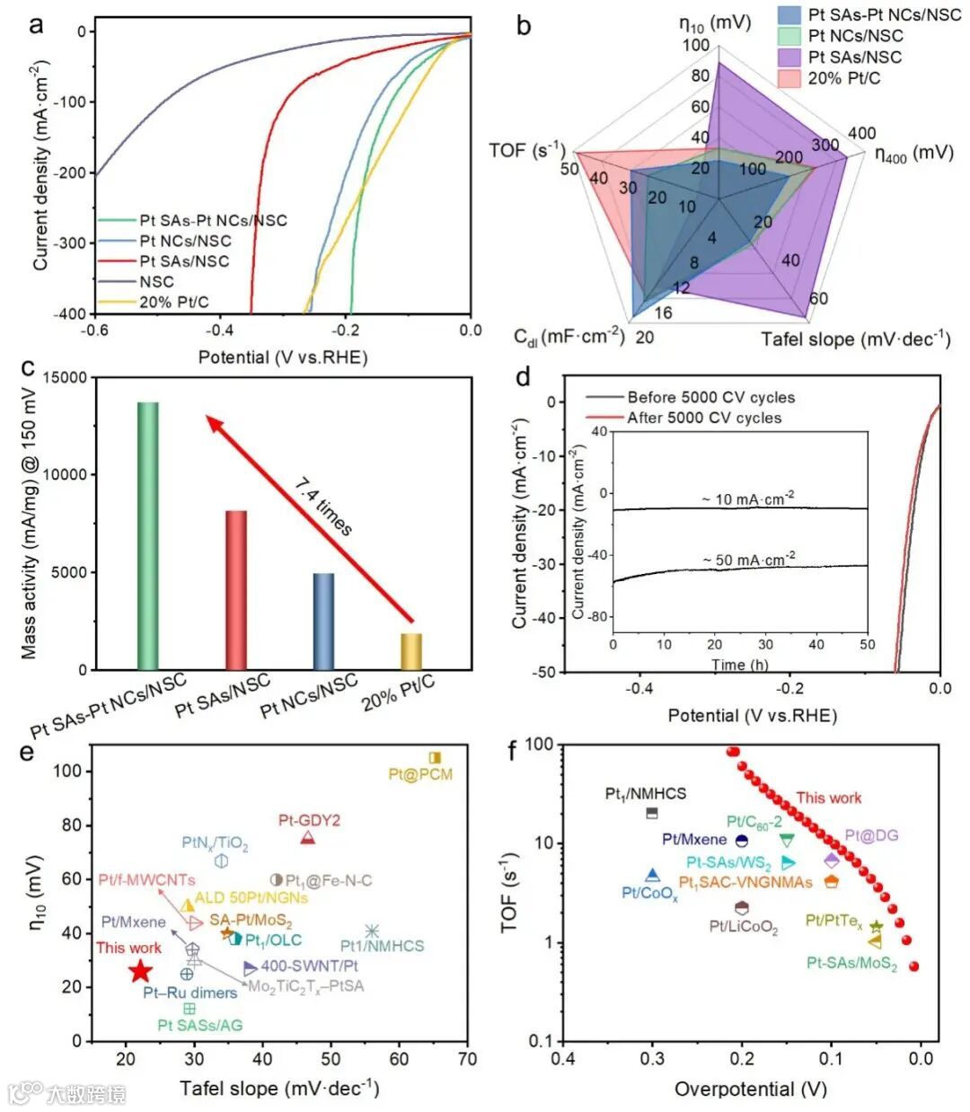 图3. a) 0.5 M H2SO4下的LSV曲线,b) 150 mV下的Tafel斜率,𝜂10,𝜂400,Cdl和TOF, c) MAs, d) 5000 CV循环前后的LSV曲线(插入的是i-t曲线),e,f) Pt SAs-Pt NCs/NSC与已报道催化剂的HER性能对比图。