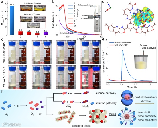 控制放电产物在空气正极表面的分布可以减小活性物质的传输阻力。利用高活性液相催化剂可以调控放电产物的成核位点,进一步改变放电产物的生长方式,调控非固态放电产物的生长过程。扫描电子显微镜、X-射线衍射曲线和电子自旋共振均能证明在放电过程中电解液中存在可溶的LiO2中间体。为了探究Ir单原子活性中心对稳定LiO2的重要作用,我们合成了不溶性Ir@POP作为正极催化剂,可以观察到棒状放电产物LiO2均匀生长在有机聚合物的表面,揭示了Ir金属可以作为LiO2的锚定位点,在稳定非固体放电产物方面发挥着至关重要的作用(图2)。