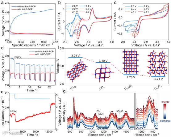 由于Ir活性中心与LiO2具有较强的相互作用,诱导缺陷态放电产物的生成。因此,该电池体系不仅可以促进液相放电产物生成而获得高放电容量和倍率性能,还可以抑制LiO2的活性,从而减少与之相关的副反应。得益于这些优点,基于非固体放电产物的锂空气电池展现出0.03 V的超低过电位和超长的循环寿命(图5)。