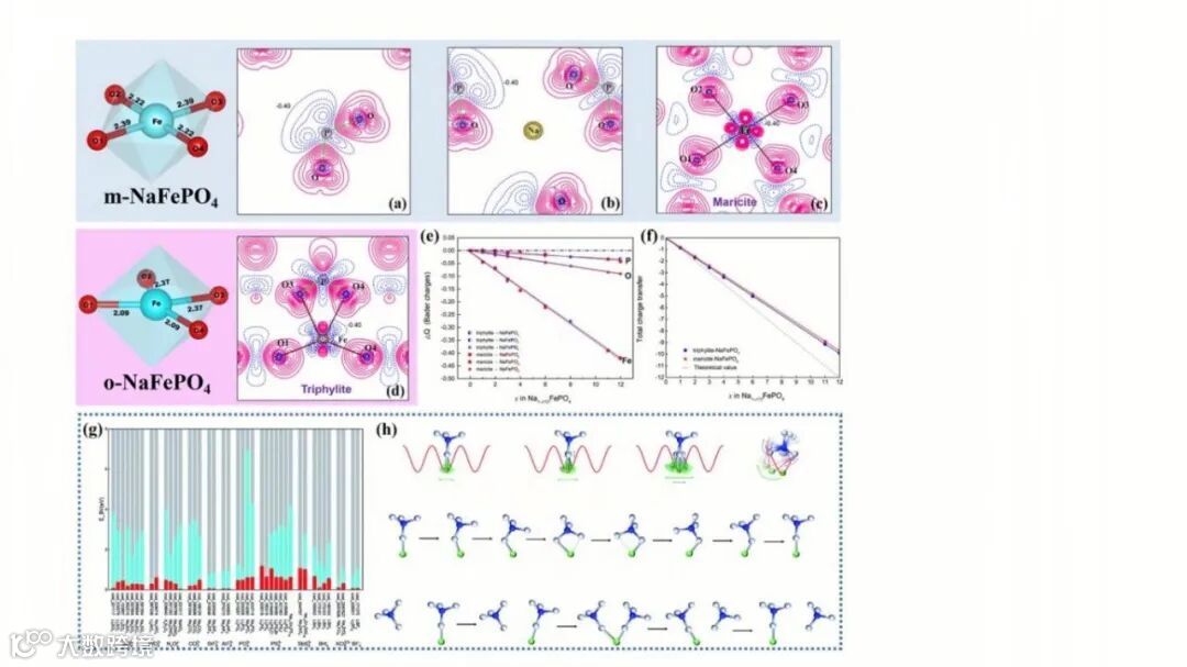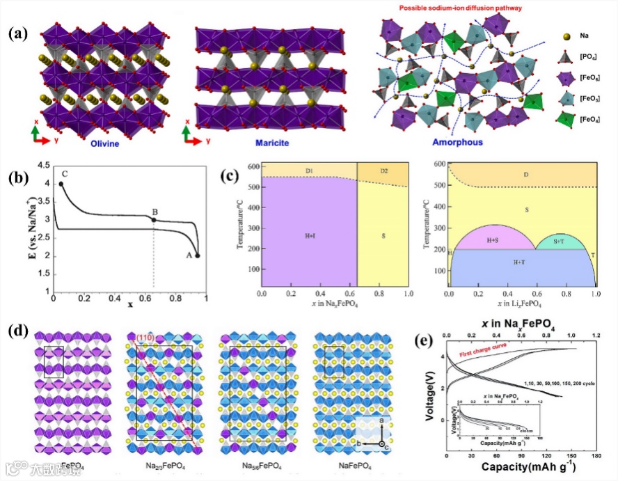 NaFePO4主要呈现olivine-type (o-NaFePO4)和maricite-type (m-NaFePO4)两种晶体结构。o-NaFePO4与LiFePO4在结构上具有相似性,二价铁离子形成八面体配位占据4c位,而钠离子占据4a位中的Wyckoff位。[FeO6]八面体和[PO4]四面体形成的框架为材料提供了沿双向的一维Na+扩散路径。与LiFePO4的充放电机理不同,o-NaFePO4的充放电过程涉及固溶反应与两相反应两个阶段,并在储钠过程中产生Na2/3FePO4、Na5/6FePO4中间相。