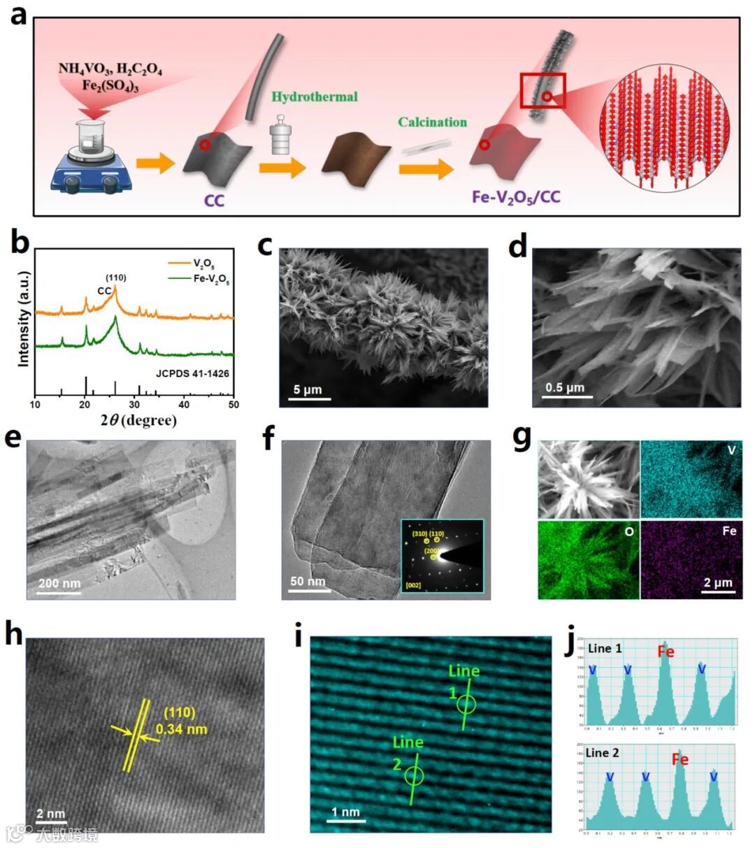 随着十四五新型储能方案和双碳政策的推出,新能源材料的研究和应用已成为必然。氨(NH3)做为氮肥生产的重要原料,同时也是理想的无碳储能载体,在诸多领域中发挥着重大的作用。目前通过Haber-Bosch技术进行的大规模氨生产存在高CO2排放和高能耗的问题。电化学NO3-还原合成NH3(NO3RR)可以在实现NO3-污染处理的同时,实现绿氨的合成。然而,NO3RR是一个复杂的八电子转移过程,涉及多个中间体及副产物的生成,并受到竞争性析氢反应(HER)的影响。因此,迫切需要探索高活性和选择性的NO3RR催化剂。单原子催化剂(SACs)由于可调控的配位环境和最大化的原子利用率而在电催化反应中广泛应用。其次,考虑到将金属原子掺杂到过渡金属氧化物(TMOs)中是一种创建路易斯酸位点的可行方法,因为掺杂剂/TMOs的强电子相互作用导致不同金属原子的电荷重新分布,同时TMOs是理想的限掺材料,路易斯酸位由于其多价态、可调控的电子结构和高的化学稳定性,特别是当金属掺杂处于孤立的单原子状态时,可以很容易地形成高密度的Lewis酸位点,从而最大化Lewis酸度,大大提高催化剂的NO3RR活性。V2O5是一种新兴的TMOs材料,由于其天然的丰度、易于合成、热稳定性和可变的氧化态而被广泛应用于各种催化反应中。因此本文将过渡金属氧化物V2O5作为基底来固定Fe单原子,构建路易斯酸Fe-V对,有效促进硝酸盐电还原合成氨。