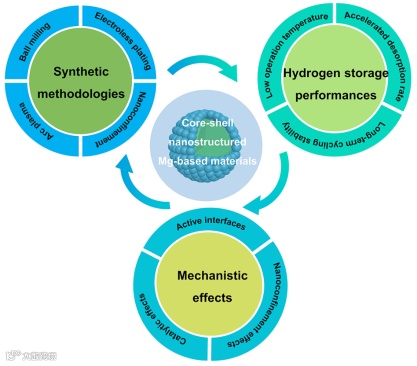 图1. 核壳结构纳米氢化镁的合成方法、催化机理和储氢性能之间的构效关系