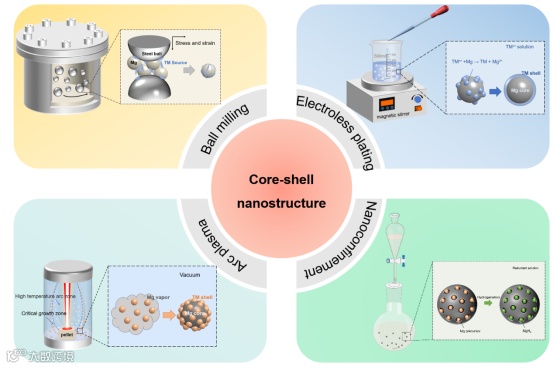 核壳结构纳米镁基储氢材料的制备方法主要包括高能球磨法、等离子体法、化学镀法和纳米限域法。其中,高能球磨法、等离子体法为物理手段,化学镀法和纳米限域法为化学法。这些方法可从纳米尺度进行设计和调控纳米镁基储氢材料的核壳结构,从而显著降低吸放氢温度,提升动力学性能。其中,球磨法和等离子体法操作简单,可控性强,但颗粒尺寸仍相对较大;化学镀法制备的核壳颗粒均匀程度难控制,合成反应对反应条件敏感;纳米限域法所需模板材料较多,降低体系的总储氢量且合成过程复杂。