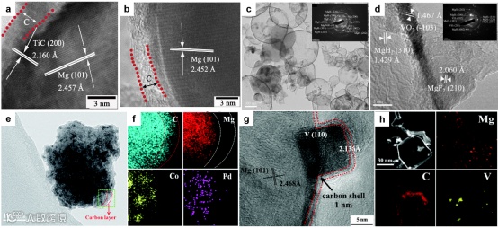 首先,带有过渡金属元素的催化壳可以加速H-H和Mg-H键的解离。此外,金属化合物壳层,如氧化物、碳化物、卤化物、碳化物等,可以原位形成多物相多价态的核壳催化结构。纳米结构的 MgH2/Mg 核缩短了 H 原子的扩散路径,提高了动力学性能。