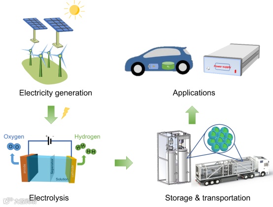 综合考虑上述因素,文章指出核壳结构纳米镁基储氢材料有望在未来可以得到更为广泛的应用。如利用太阳能、风能等可再生能源产生的电力电解水可以获得绿色环保的氢气,并将氢气储存在固体镁基储氢罐中。核壳纳米结构镁基材料可以在相对较低的温度下吸收和释放氢气,从而显着降低储氢过程中的能耗。该存储系统通过热解或水解产生氢气,可为燃料电池提供氢源,用于发电、小型便携式应急电源、工业用途等。核壳纳米结构镁基材料在壳结构的保护下具有优异的可逆性,未来可应用于大型储运氢系统。