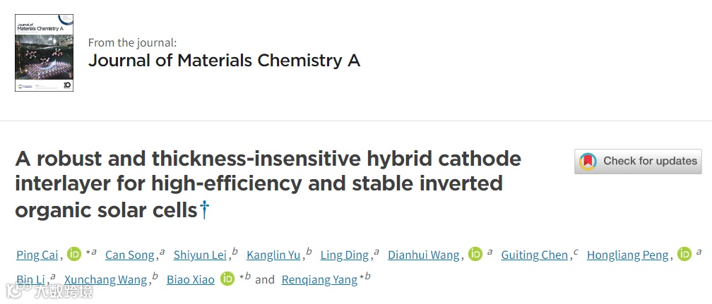 近日,桂林电子科技大学蔡平与江汉大学肖标、阳仁强等合作,在国际知名期刊Journal of Materials Chemistry A上发表题为“A robust and thickness-insensitive hybrid cathode interlayer for high-efficiency and stable inverted organic solar cells”的文章。该文章报道了,作者巧妙地将可交联型界面聚合物(PFOPy)和n型自掺杂界面分子(PDINN)相结合,开发了一种坚韧、厚度不敏感的杂化阴极界面层(PFOPy-N),从而实现了高效、稳定的倒置有机太阳电池。