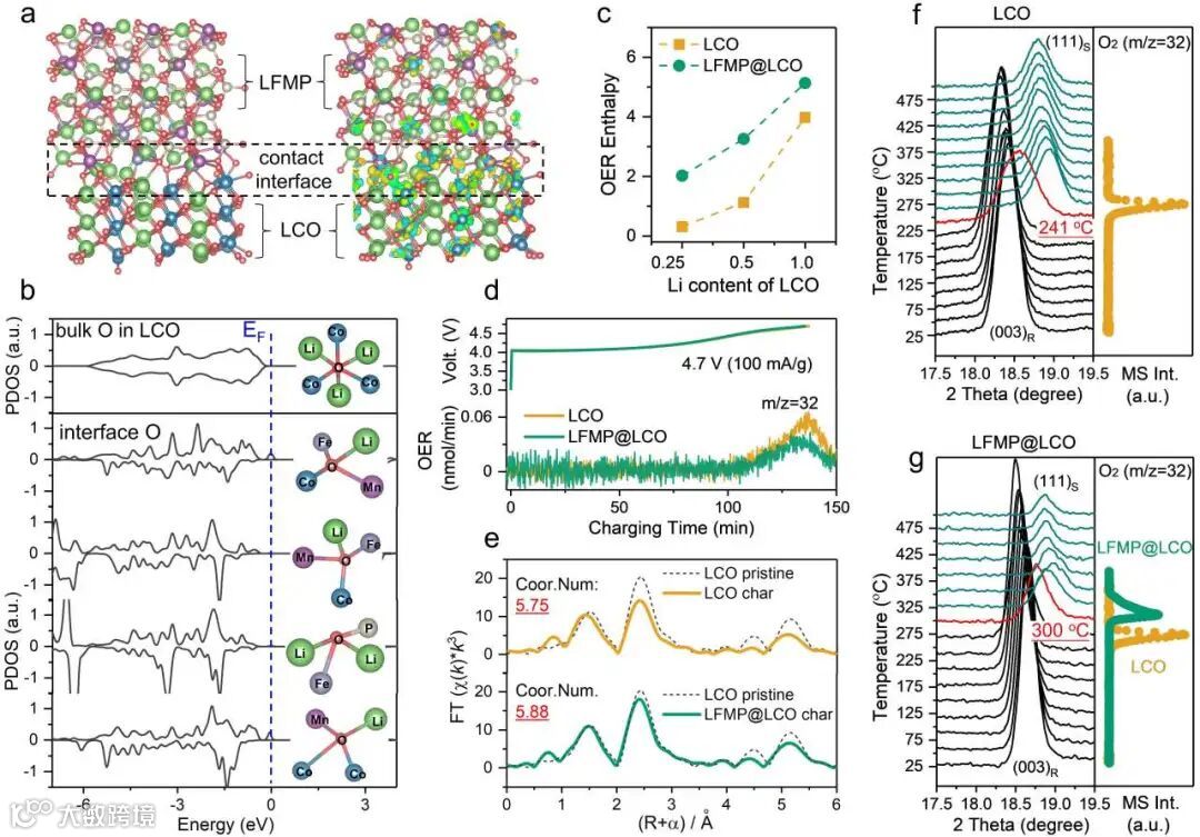 Figure 5. (a) The lattice structure between LFMP (110) and LCO (010) planes and the corresponding charge density difference (CDD) maps at the interface. The yellow region represents the increase in charge density. (b) PDOS calculations of O 2p orbitals in bulk LCO and at LFMP (110)/LCO (010) interface. The insets are the corresponding coordination environment of lattice oxygen (including octahedral configuration in LCO bulk and tetrahedral configuration at LCO/LFMP interface). The blue dotted line represents Fermi level. (c) The enthalpy of oxygen release reaction in three different scenarios: pure LCO, LCO coated with LFMP, as a function of lithium content variation. (d) OEMS analysis of the evolution of O2 on LCO and LFMP@LCO during charging. The corresponding galvanostatic charge curves are presented in the upper portion of the figure. (e) The k3-weighted Fourier transforms of cobalt K-edge EXAFS spectra measured on charged LCO and LFMP@LCO. The fitted Co-O coordination numbers are presented in the inset, implying that the CoO6 plates are better preserved in LFMP@LCO. (f-g) XRD patterns and MS profiles for the O2 during heating of delithiated LCO and LFMP@LCO. The results demonstrate that the thermal stability of LFMP-LCO blended cathodes is improved, as its onset temperatures for the structural transformation and the release of O2 are postponed.