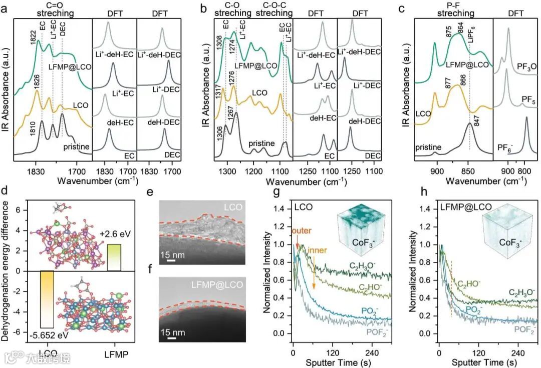 Figure 4. (a-c) DRIFT spectra of the (a) C=O stretching region, the (b) C-O and C-O-C stretching region and the (c) P-F stretching region acquired from pristine LCO, charged LCO and LFMP@LCO surface after long cycling without additional rinsing, allowing the electrolytes to remain. The figures on the right-hand side display simulated spectra of dehydrogenated EC (deH-EC), Li+-coordinated EC (Li+-EC), and Li+-coordinated dehydrogenated EC (Li+-deH-EC). Simulated spectra of DEC-derived species (deH-DEC, Li+-DEC, and Li+-deH-DEC) are also presented. Simulated spectra of PF6- as well as its hydrolysis products (PF5, PF3O) are also displayed. (d) Calculation results of the energy difference obtained by the energy of adsorbing complete EC on the cathode (LCO and LFMP) surface minus the energy of binding dehydrogenated EC to the cathode surface. (e-f) TEM images of cycled LCO and LFMP@LCO surface. The CEI outline is marked with orange dotted lines. (g-h) TOF-SIMS depth profiles (normalized to maximum) of fragments of interest (organic C2HO-/C2H3O- and inorganic PO2-/POF2-) obtained on cycled LCO and LFMP@LCO cathodes. The insets show the 3D distribution of dissolved Co species (CoF3-).