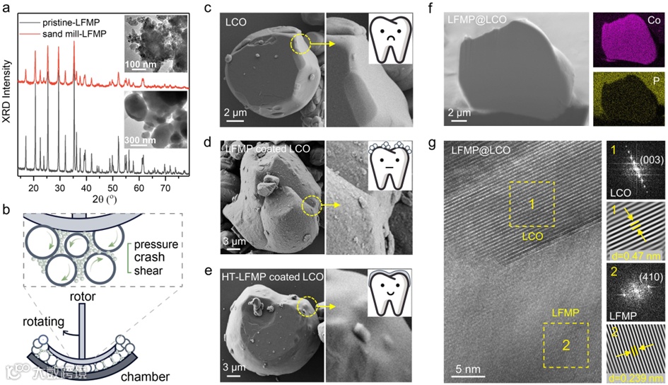 Figure 1. (a) XRD patterns of LFMP before and after sand milling processing. The insets are their TEM images respectively. (b) The operating principle of high-speed solid-phase coating machine. (c-e) SEM images of (c) pristine LCO, (d) LCO with homogeneous LFMP nanoparticle layer and (e) continuous LFMP enamel-like layer. The insets correspond to highly magnified SEM images that respectively reveal surface details. (f) FIB-SEM image of LFMP@LCO and elemental distribution of Co, P. (g) HR-TEM image and the corresponding fast Fourier transform (FFT) and inversed FFT (IFFT) of the selected areas at the interface boundary between LCO and LFMP enamel-like layer.