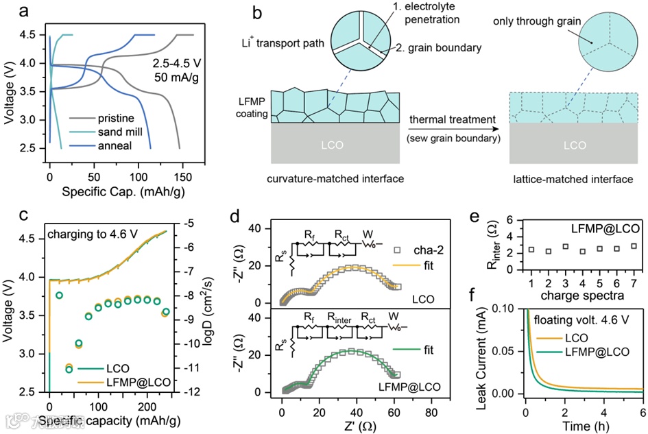 Figure 2. (a) The first charge/discharge profile curves of pristine LFMP, sand-milled LFMP and thermally treated LFMP. The cells were charged to 4.5 V in a CCCV mode (hold 4.5 V for 2 hours) and discharged to 2.5 V at the current density of 50 mA/g. (b) The schematic illustration of Li ions transport path at curvature-matched LFMP/LCO interface formed through sand milling and high-speed coating processing and lattice-matched interface formed via thermal treatment. (c) The GITT curves of LCO and LFMP@LCO and the corresponding Li diffusion coefficients during charging to 4.6 V. (d) The second charge state EIS spectra and the fitting results of LCO and LFMP@LCO. The corresponding equivalent circuit diagrams are displayed in the insets. (e) Fitting results of lattice-matched interface impedance (Rinter) during charging to 4.6V. (f) Leakage current profiles during floating-charge tests (with a floating time of 6 h) for LCO and LFMP@LCO.