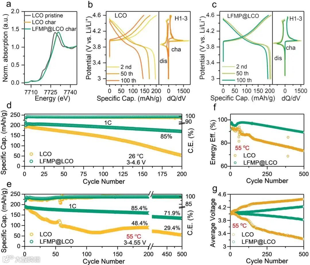 Figure 3. (a) XANES spectra of pristine LCO, charged LCO and charged LFMP@LCO. (b-c) Typical galvanostatic charge/discharge profiles curves and the corresponding dQ/dV curves of (b) LCO and (c) LFMP@LCO cathodes at 1 C (1 C=200 mA/g) for 3-4.6 V. (d) Discharge capacity hysteresis against cycle numbers profiles of LCO and LFMP@LCO within 3-4.6 V in half cells under 1 C at room temperature. (e) Discharge capacity hysteresis, (f) energy efficiency, and (g) average voltage against cycle numbers profiles of LCO and LFMP@LCO within 3-4.55 V in half cells under 1 C at 55 oC.