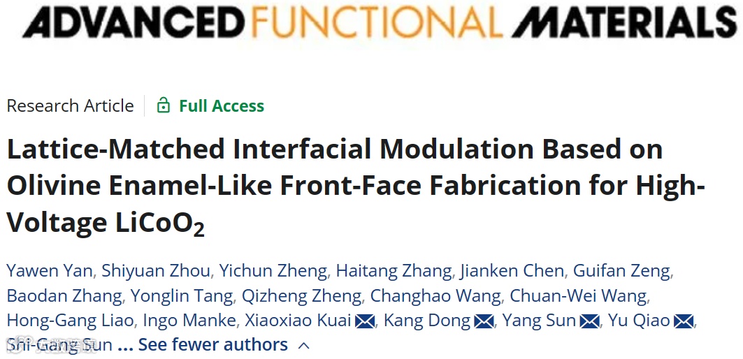 近日,来自厦门大学的乔羽教授、蒯笑笑博士与中山大学孙洋教授、中科院高能物理所的董康研究院合作,在国际知名期刊Advanced Functional Materials上发表题为“Lattice-Matched Interfacial Modulation Based on Olivine Enamel-Like Front-Face Fabrication for High-Voltage LiCoO2”的研究文章。