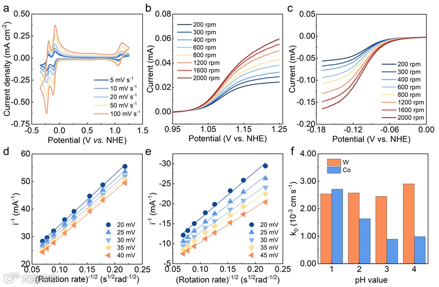 图3. {CoW12}在pH值为1时的电化学动力学测试:a) 扫描速率为5 ~ 100 mV s-1时{CoW12}的CV曲线;旋转圆盘电极(RDE)测量了在200 ~ 2000 rpm 8种不同转速下,b) {CoO4}内核的电化学氧化和c) {W12O36}外壳的电化学还原(扫描速率为10 mV s-1);d)电氧化从{(CoIIO4)WVI12O36}到{(CoIIIO4)WVI12O36}的Koutecky-Levich图;e)由{(CoIIO4)WVI12O36}电还原为{(CoIIO4)WVI12O36};f) {CoO4}内核和{W12O36}外壳在pH分别为1、2、3和4时的氧化还原反应的k0。