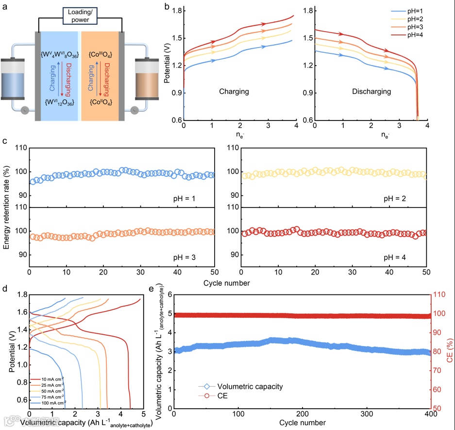 {CoW12}拥有宽的电化学窗口和快速的电子转移动力学,适合应用于液流电池(图4a)。充电过程中,负极{(CoIIO4)WVI12O36}得到4电子转化为{(CoIIO4)WV4WVI8O36};正极{(CoIIO4)WVI12O36}失去1电子转化为{(CoIIIO4)WVI12O36}。放电过程发生逆反应过程。其中pH为4时,电池的放电平台最高为1.56 V(图4b)。在pH为1 ~ 4的条件下,50圈循环测试中,电池的能量保持率分别为98.6%、97.8%、99.7%和99.3%。在pH为4的条件下, {CoW12}对称型液流电池在10-100 mA cm-2的电流密度下倍率性能良好。400圈长循环的平均库伦效率为99%,容量保持率高于96%。据我们所知,这是首次在不改变结构和组成的情况下,通过调节储能液相电对的电子转移过程,实现液流电池输出电压的调控。