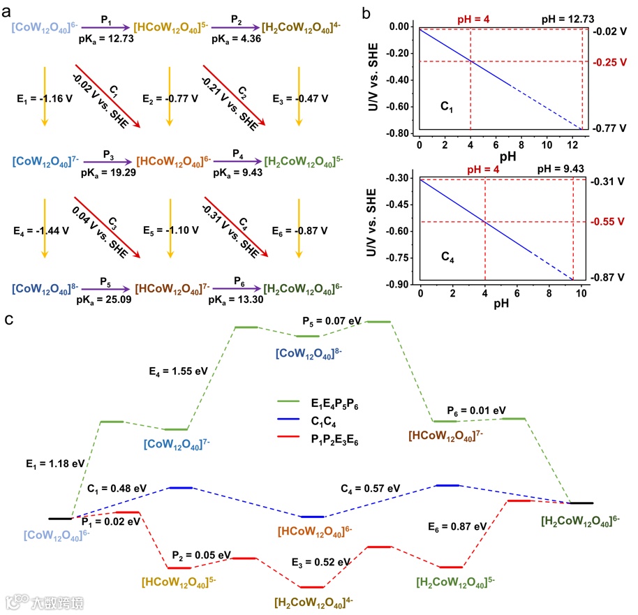 图2. a) 电化学还原[CoW12O40]6-生成[H2CoW12O40]6-的反应网络图,涉及两个电子和两个质子的转移。紫色和黄色箭头表示顺序的电子转移和质子转移反应,红色箭头表示协同的质子-电子转移反应;b) C1和C4协同过程的pH依赖性初始电位图;c)[CoW12O40]6-生成[H2CoW12O40]6-的活化能网络图(E1E4P5P6、C1C4和P1P2E3E6三条路径)。