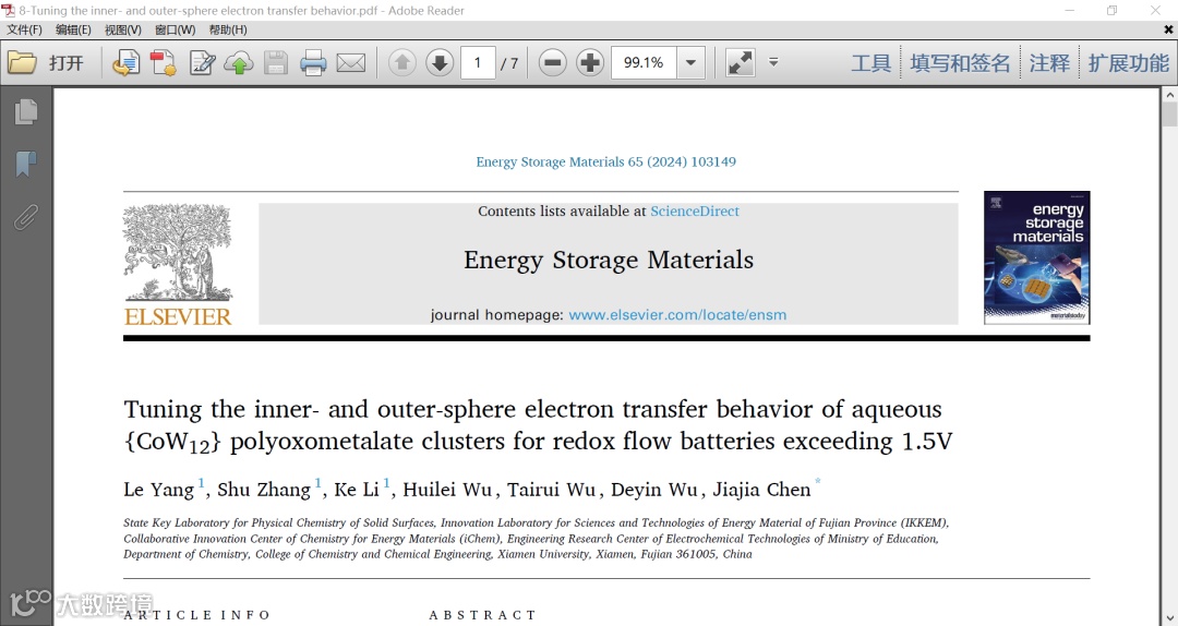 调控{CoW12}多金属氧酸团簇内外球电子转移行为实现超1.5 V水系液流电池