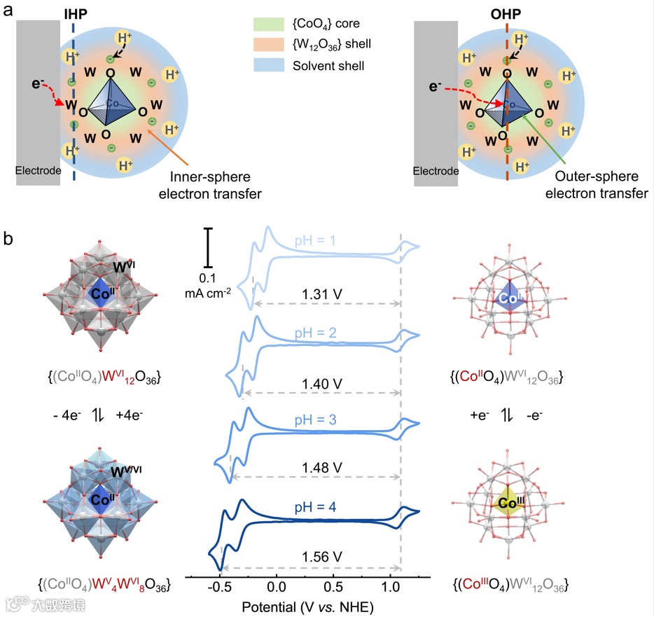 图1. a) {CoW12}团簇中{W12O36}外壳的内球电子转移(左图)和{CoO4}内核的外球电子转移(右图)示意图;b) 以Co和W原子为氧化还原活性中心的{CoW12}团簇材料的循环伏安曲线和晶体结构示意图。