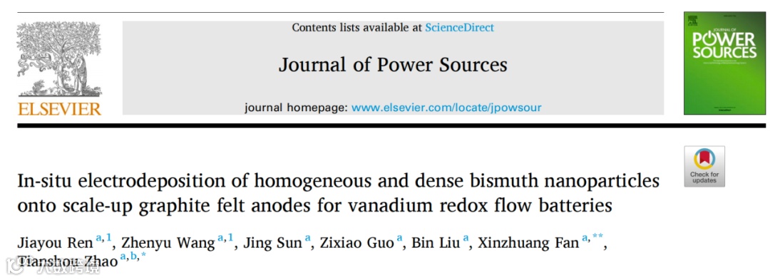 近日,香港科技大学赵天寿院士及范新庄博士在Journal of Power Sources 上发表了题为“In-situ electrodeposition of homogeneous and dense bismuth nanoparticles onto scale-up graphite felt anodes for vanadium redox flow batteries”的研究论文。该研究论文揭示了传统电沉积过程中铋颗粒直径较大且分散度高的机理,并提出采用具有较低钒离子浓度的正极电解液进行原位电化学沉积的方法,即使在较低的沉积电流密度下依然可以得到直径较小且致密分布的铋纳米颗粒,显著提高了钒液流电池的能量效率。