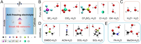 图8. 各种防冻添加剂通过氢键与水分子相互作用 (A) 防冻水电池的示意图。防冻添加剂包括(B) 阴离子、(C) 阳离子和(D, E) 有机分子,它们可以与水分子形成氢键。