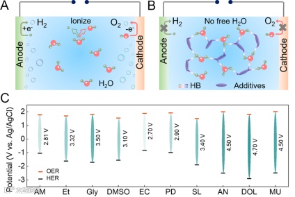 图10. 氢键化学机制及其对扩宽电化学稳定性窗口的影响 (A) 电池中HER和OER的示意图,以及 (B) 通过在水和添加剂之间形成氢键网络减少HER和OER的示意图。(C) 具有丰富氢键网络的混合电解质的电压窗口总结。