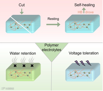 图12. 聚合物电解质因氢键效应而表现出的引人注目的性能示意图,包括自修复、保水和耐压等。