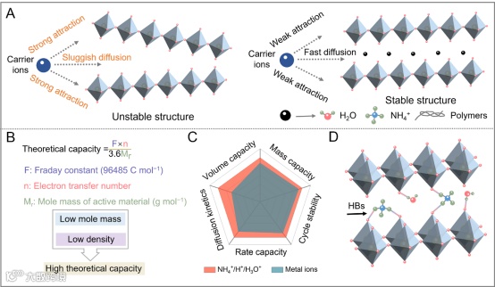 图5. 无机材料中氢键化学的效应和机制 (A) 载流子扩散到原始和改进的层状材料的示意图;(B) 高理论容量电极材料的设计原理;(C) NH4+/H3O+和金属离子电池之间的电化学性能比较;(D) NH4+/H2O与宿主材料之间形成的氢键的示意图。