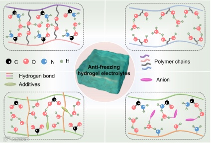 图9. 含有丰富氢键网络的防冻水凝胶电解质的示意图。氢键组成包括聚合物链中的各种功能基团、引入的阴离子或有机添加剂。