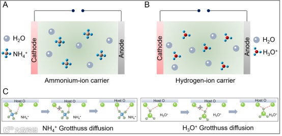 图3. A)铵离子电池和B)质子电池示意图; C) NH4+和H3O +的扩散机理说明。