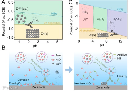 图11. 氢键化学对稳定Zn/Al沉积/溶解的作用机制 (A) Zn/水系统的简化电位-pH Pourbaix图。(B) 通过添加剂和水分子之间的氢键相互作用改善的Zn负极的示意图。(C) Al/水系统的简化电位-pH Pourbaix图。