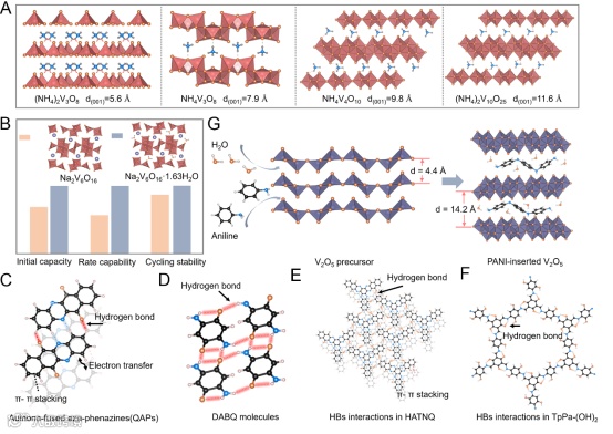 图6. 无机和有机电极材料中氢键化学的作用机制 (A) NH4+包含的基于V的材料的氢键结构示意图; (B) Na2V6O16和Na2V6O16·1.63 H2O在初始容量、倍率性能和循环稳定性方面的性能比较。 氢键结构示意图,包括(C) QAPs、(D) DABQ、(E) HATNQ、(F) TpPa-(OH)2分子和(G) PANI插入的V2O5。