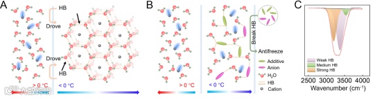图7. 氢键在抗冻电解质中的作用 (A) 水结冰过程和机制的示意图,以及 (B) 通过在水分子和添加剂/阴离子之间形成氢键网络实现的水防冻机制的示意图。(C) 由FTIR谱拟合的水中的氢键种类。