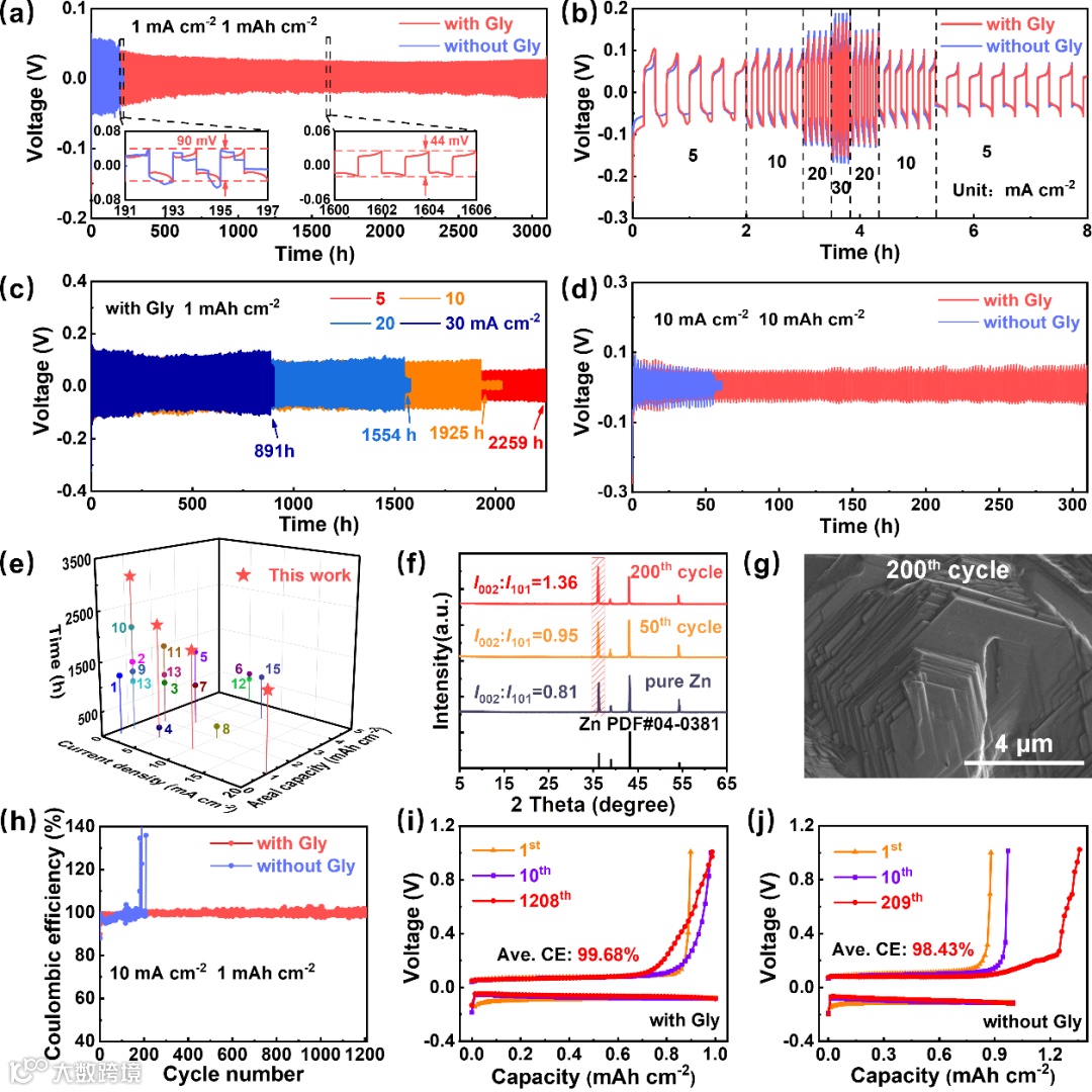 从N1s光谱(图1d)可以得出,甘氨酸通过氨基锚定在锌阳极表面。值得注意的是,与裸锌相比,浸泡后的锌阳极的Zn 2p信号发生了0.2 eV的正位移(图1e),这表明锌阳极与吸附的甘氨酸之间存在由锌向甘氨酸的电荷转移。自发腐蚀实验结果显示,锌阳极在不含甘氨酸的电解液中浸泡3天后,表面出现强度较高的副产物的特征衍射峰(图1f)。相比之下,浸泡在含有甘氨酸的电解液中的锌阳极没有出现副产物的特征衍射峰,表明副反应被显著抑制。线性极化实验(图1g)显示,在含有甘氨酸的电解液中,锌阳极腐蚀电位更高,腐蚀电流密度更低,表明在甘氨酸界面相保护下,界面腐蚀反应动力学被抑制。此外,如图1h所示,在含有甘氨酸的电解液中,锌阳极表现出更大的析氢反应(HER)和析氧反应(OER)过电位,从而获得更宽的电化学稳定窗口。