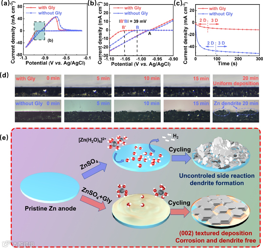 采用循环伏安法(CV)和计时电流法(CA)研究了甘氨酸对Zn2+在阳极表面成核/扩散的调控作用(图4a-c)。结果表明,甘氨酸吸附在阳极表面可以提供更多的成核位点,增加Zn2+的成核概率,降低临界成核半径,并且有助于缓解“尖端效应”以便于获得均匀的Zn成核和沉积形貌。从图4d可以直观地观察电极/电解液界面处的锌电沉积过程,在没有甘氨酸的电解液中,锌阳极在前5分钟内产生“尖端”位点,并在接下来的15分钟内成长为尖锐的枝晶。然而,在含有甘氨酸的电解液中,锌阳极表面平坦,没有发现明显的枝晶。