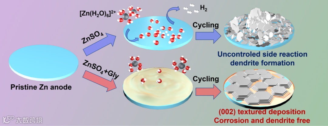 图1. 甘氨酸添加剂抑制水致副反应并实现Zn2+沿(002)晶面定向沉积的机理示意图