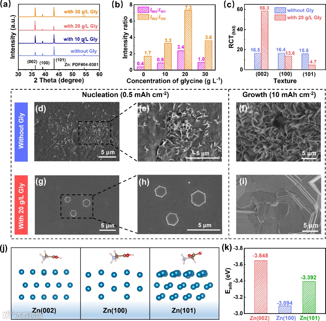 图3. 甘氨酸对锌沉积晶面选择性的调控作用及其机理研究