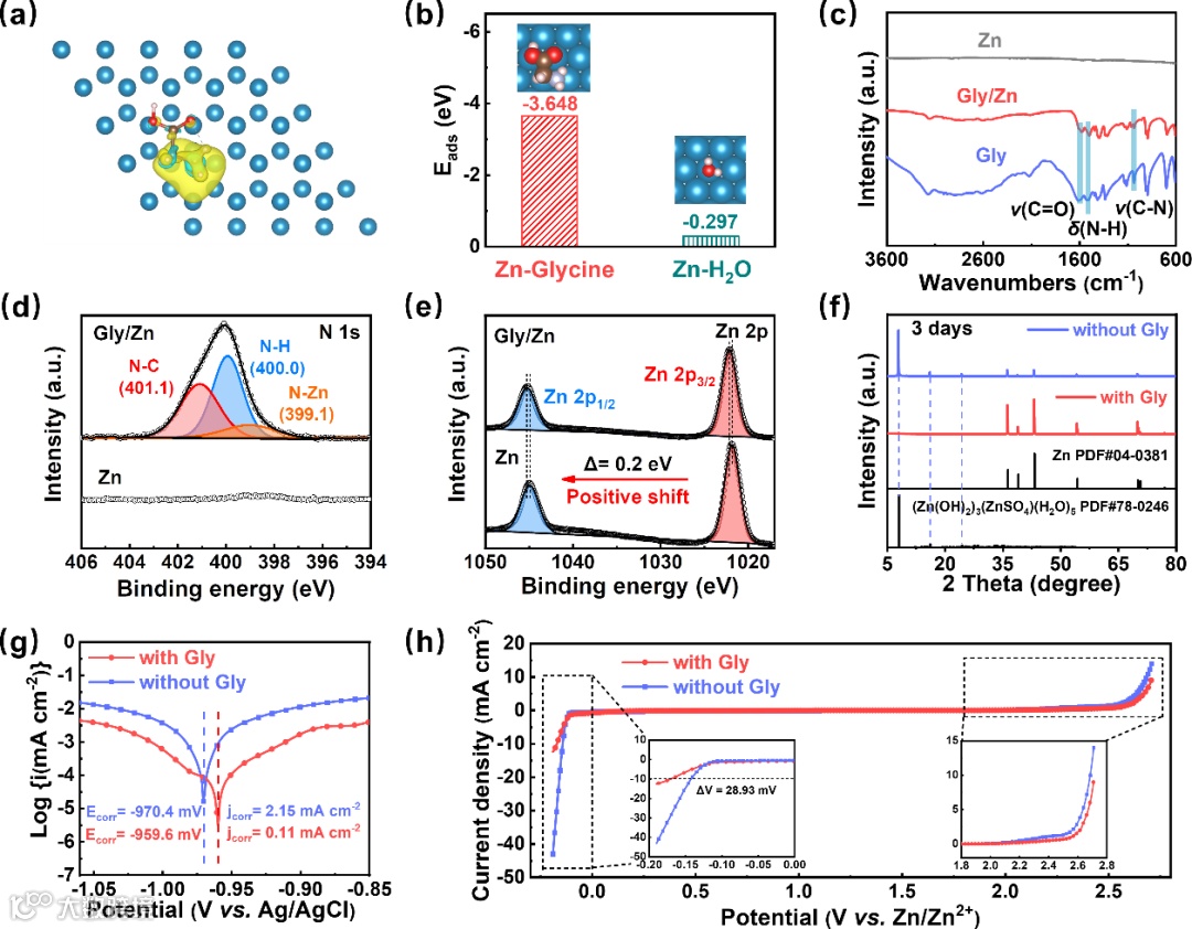 首先,为了确定甘氨酸和H2O在锌阳极表面的吸附优先级,进行了密度泛函理论(DFT)计算。吸附模型的差分电荷密度如图1a所示。与H2O分子相比,甘氨酸在Zn(002)晶面上的吸附能(−3.648 eV)远低于H2O(−0.297 eV)(图1b),表明甘氨酸将优先于H2O分子吸附在锌阳极表面。全反射傅里叶变换红外光谱(ATR-FTIR)证实了甘氨酸在锌阳极上的吸附,如图1c所示,金属锌的谱图中没有明显的特征峰,而在20 g L−1甘氨酸溶液中浸泡3天后,锌阳极表面的特征峰与甘氨酸粉末相似。X射线光电子能谱(XPS)结果进一步证实了甘氨酸与锌阳极之间的化学相互作用。