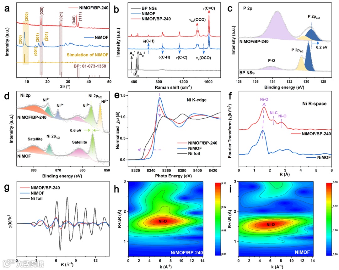 图3. 物相,表面和化学态分析。(a) XRD图。(b) Raman图。(c) P 2p XPS谱图。(d) Ni 2p XPS谱图。(e) X射线吸收近边结构图。(f) R空间的扩展X射线吸附精细结构图。(g) 震荡图。小波变换图:(h) NiMOF/BP-240. (I) NiMOF。
