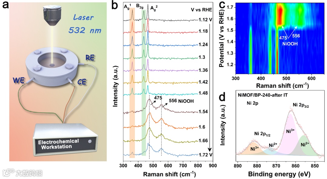 图5. (a) 原位拉曼装置图示。(b) 电压决定的原位拉曼数据。(c) 2D原位拉曼数据。(d) 稳定性测试后的Ni 2p XPS谱。