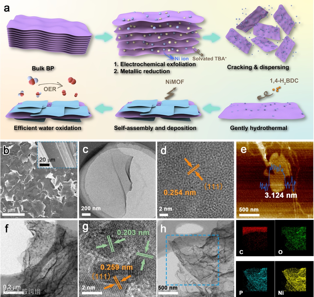 图2. NiMOF/BP的合成路径和结构表征。(a) 制备过程示意图。BP NSs的物理表征: (b) SEM图(内插图为块体黑磷)。(c) TEM图。(d) HRTEM图。(e) AFM图。NiMOF/BP的物理表征: (f) TEM图。(g) HRTEM图。(h) 元素分布图。