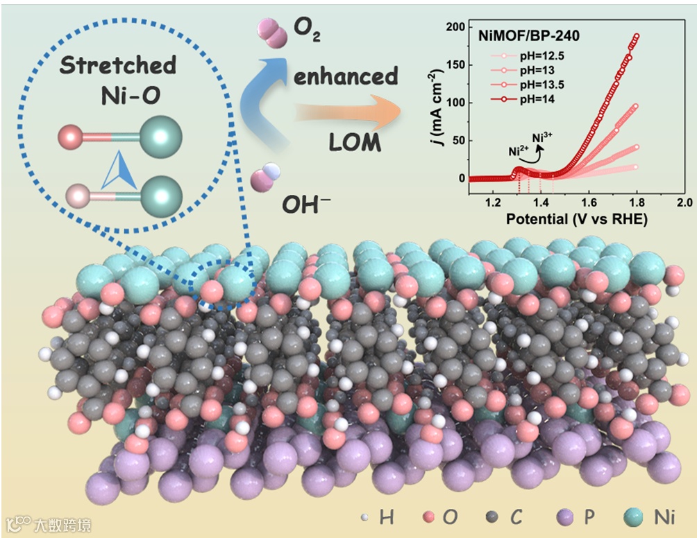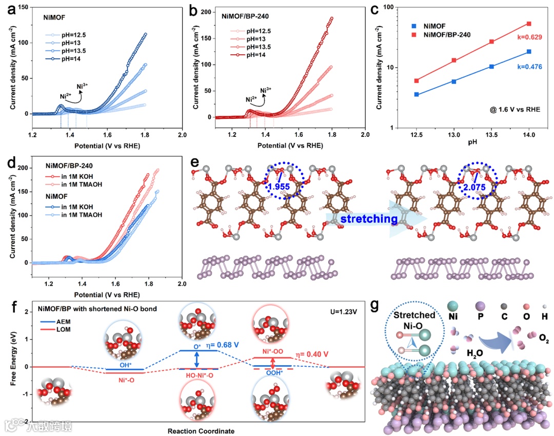 pH依赖性动力学和四甲基铵阳离子(TMA+)基准控制实验证明了NiMOF/BP催化剂中LOM路径的增强。为了深入了解其机理,研究者们进行了DFT 计算:NiMOF与BP结合后,Ni-O键的拉伸可以平衡LOM路径的电催化剂在OER过程中的中间吸附行为。