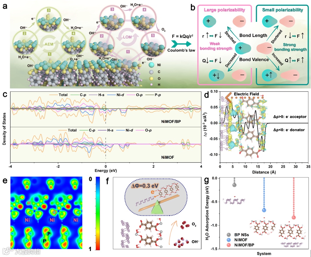图1. OER途径、metal-O键极化率和NiMOF/BP结构的理论概况。(a) AEM和LOM 路径示意图。(b) metal-O键长度/价态对键的极化度的影响。(c) NiMOF/BP和NiMOF 的态密度。(d) NiMOF/BP的平面平均电荷密度差,其中蓝色和黄色区域分别表示电荷耗尽和积累。(e) NiMOF/BP的电子局域函数。(f) 功函数结果。(g) NiMOF、BP和NiMOF/BP的 H2O吸附能。