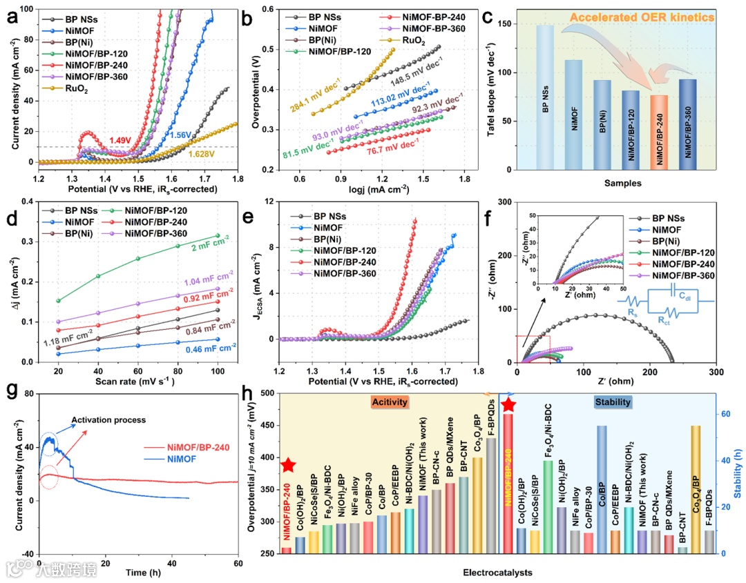 图4. (a) LSV曲线。(b) Tafel slope图。(c) Tafel slope对比图。(d) 催化剂的双电层电容。(e) ECSA归一化的LSV曲线。(f) EIS曲线。(g) 稳定性数据。(h) 与近来报道的BP基和MOF基催化剂对比图。