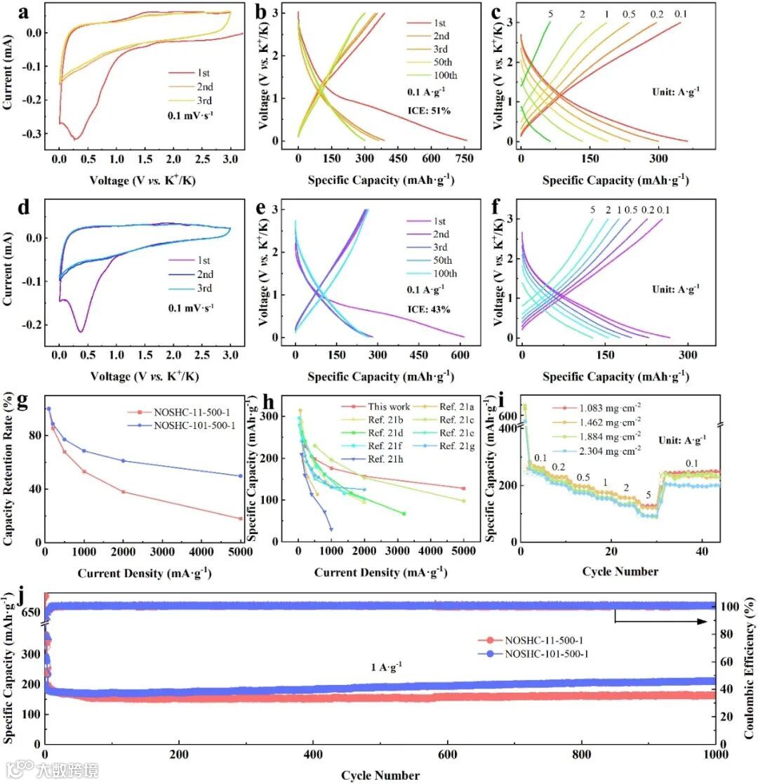 图4. NOSHC-11-500-1与NOSHC-101-500-1在半电池NOSHC//K测试体系中储钾性能对比。