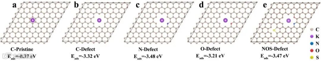图7. 理论计算结构模型及储钾吸附能对比。
