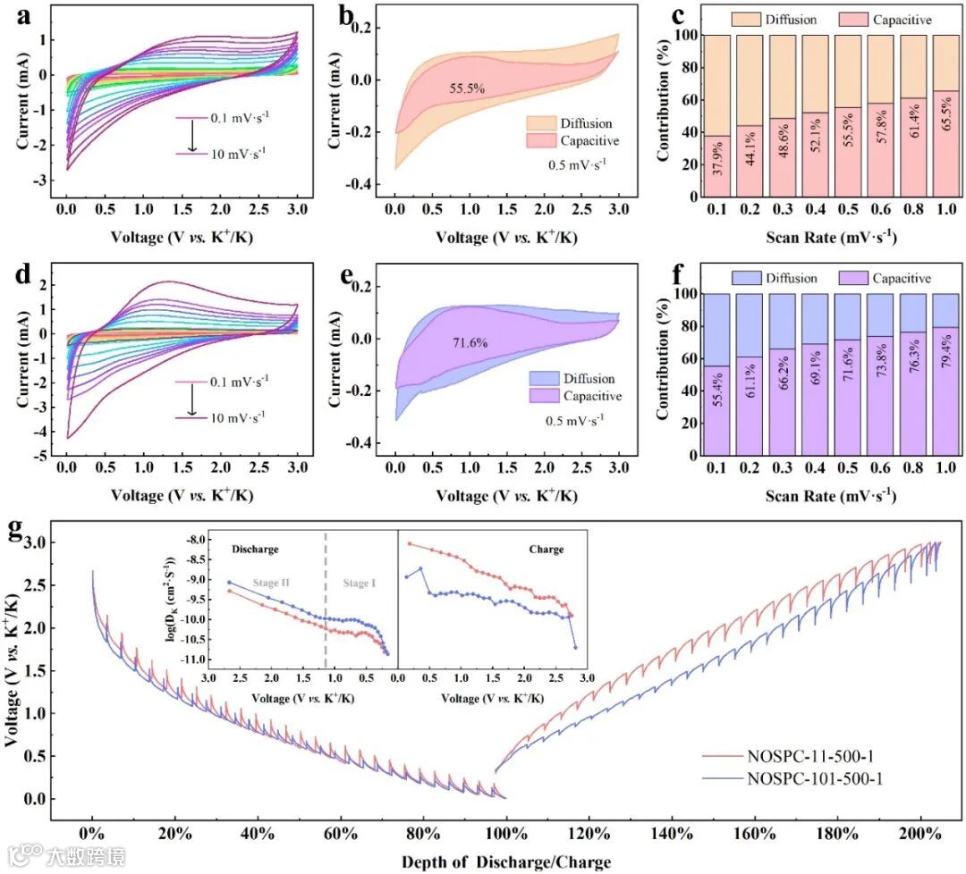 在半电池NOSHC//K测试体系中,缺陷浓度更高的颗粒状NOSHC-11-500-1在反应更为充分的小电流测试中,表现出略高的比容量,而表面开放的NOSHC-101-500-1则显示出更为快速的离子传输,电流密度提升至5 A g-1时依然拥有50%的容量保留率。同时,在不断的充放电循环中,NOSHC-101-500-1的内部结构发生重整优化,内部活性位点暴露更为充分,比容量有所提高,同时电压滞后现象得到一定程度的缓解,电荷转移电阻(Rct)减小,使得钾离子扩散更快,极化减轻,能量效率得到提升。NOSHC-11-500-1与NOSHC-101-500-1两者均表现出典型的赝电容主导的储能行为,材料中的缺陷为主要活性位点。恒电流间歇滴定法(GITT)测试结果显示,表面开放的NOSHC-101-500-1具有更快速的钾离子扩散动力学。