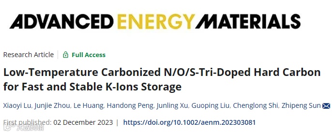 近日,广东工业大学孙志鹏教授课题组,在国际知名期刊Advanced Energy Materials上发表题为“Low-Temperature Carbonized N/O/S-Tri-Doped Hard Carbon for Fast and Stable K-Ions Storage”的研究。该研究提出一种在较低碳化温度下制备保留更多活性位点的N/O/S三掺杂硬碳材料(NOSHC)的策略,制备所得的具有独特开放表面的少孔片层状硬碳负极材料表现出快速的传输钾离子能力和良好的倍率性能,在5 A g-1大电流密度下依然拥有50%的容量保留率。